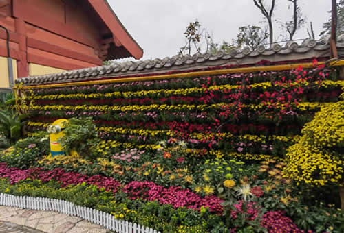 水榭和室外展區(qū)主要以新鮮奇特、互動(dòng)性強(qiáng)營(yíng)造氛圍,通過(guò)菊花造型、菊花造景、菊花插花和菊花文化等形式展現(xiàn)菊花藝術(shù)形式。